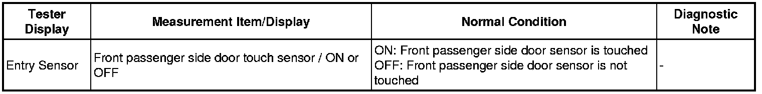If the front passenger door entry unlock function does not operate but the entry lock operation operates, the communication line between the vehicle and electrical key transmitter is normal. Either of the following may have occurred: 1) the door outside handle touch sensor is malfunctioning; or 2) the front door ECU RH receives the door outside handle touch sensor ON signal, but is unable to send the signal to the certification ECU through CAN communication.