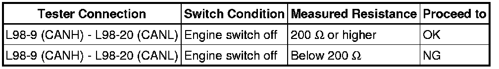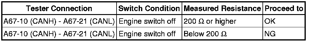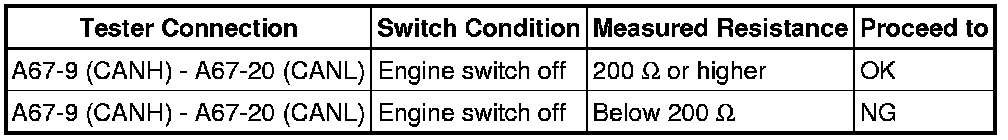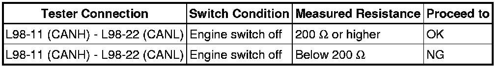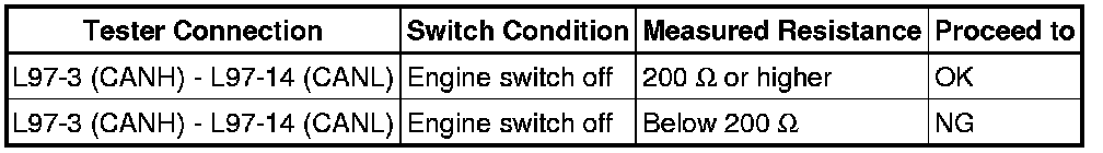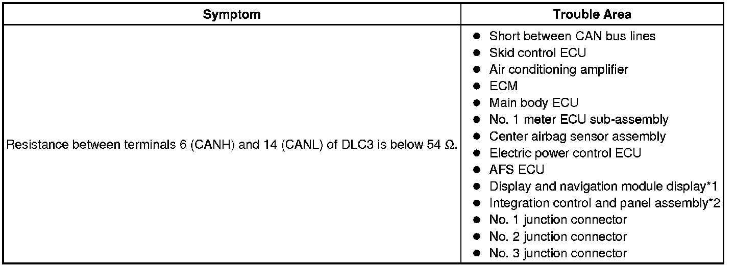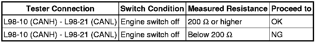 There may be a short circuit between the CAN bus lines when the resistance between terminals 6 (CANH) and 14 (CANL) of the DLC3 is below 54 Ohms.