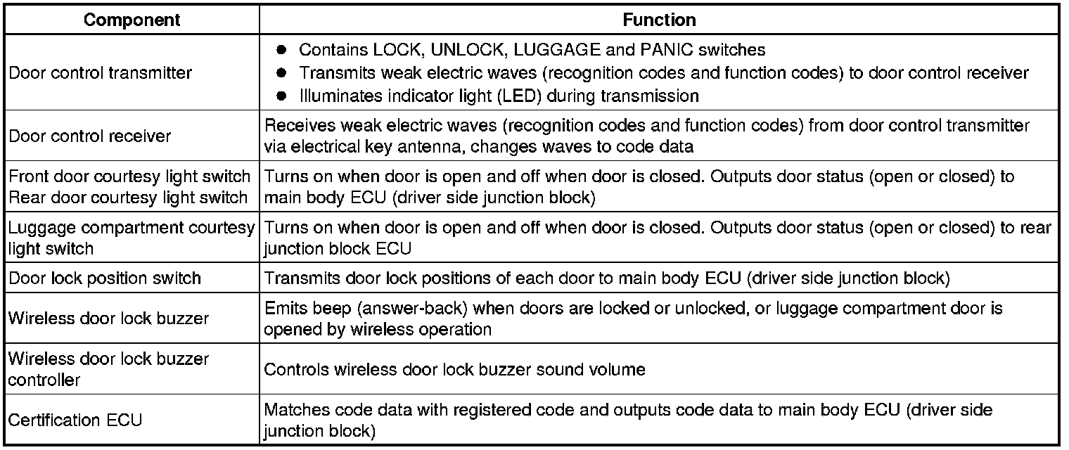 * The certification ECU performs the code identification process and the main body ECU (driver side junction block) controls the door lock. A serial data link is provided for communication between the certification ECU and main body ECU (driver side junction block).