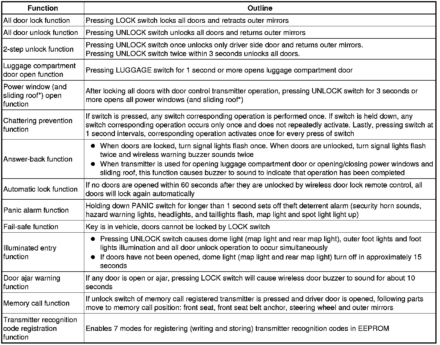 * A key-integrated type transmitter is used and it contains the following 4 switches: LOCK switch, UNLOCK switch, LUGGAGE switch and PANIC switch.