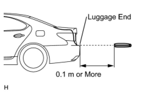 (3) Inspect the key lock-in prevention's detection area and the entry door control receiver for wave leaks. Hold the key at the same height as the lower edge of the luggage compartment door and aligned with the center of the rear of the vehicle. Pay attention to the direction and position of the key shown in the illustration. Check that when the key is over 0.1 m (0.328 ft.) from the vehicle's rear bumper, the wireless buzzer does not sound. If the warning buzzer sounds, the entry door control receiver may have a wave leak.