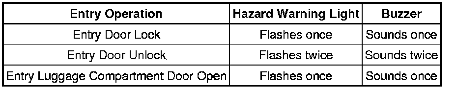 (1) Place the key in the luggage compartment with all doors locked. Check that: 1) closing the luggage compartment door triggers the key's wireless buzzer (which lasts approximately 2 seconds), and 2) pressing the luggage door opener switch opens the luggage compartment door.
