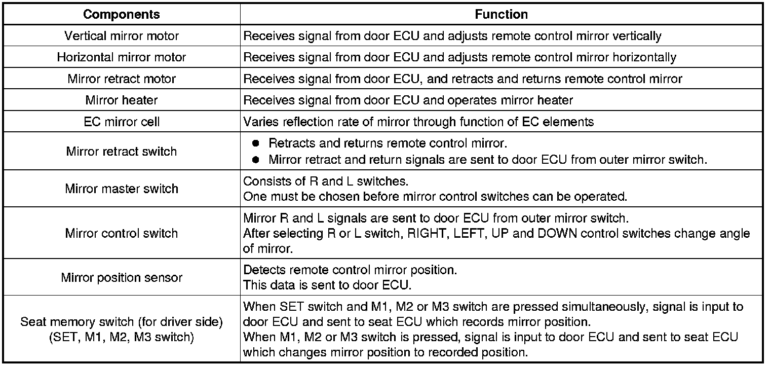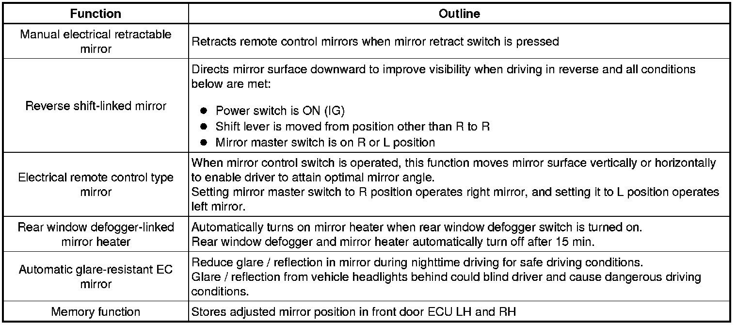 (a) This system has the following functions: automatic glare-resistant electrochromic (EC) mirror, reverse shift-linked mirror, electrical remote control type mirror, memory function, and rear window defogger-linked mirror heater.
