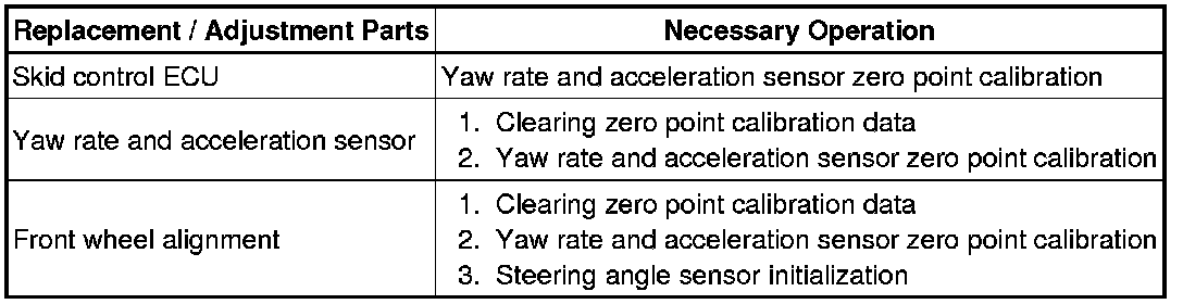 * After replacing the VSC relevant components or performing "Front wheel alignment adjustment", clear and read the sensor calibration data.