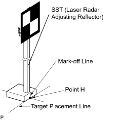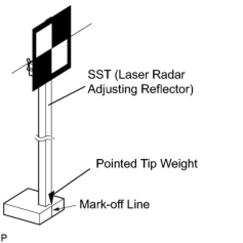 (2) Hang a weight with a pointed tip from the center of the target sheet. Then, with double-sided tape, attach the target sheet to the reflector so that the weight aligns with the mark-off line of SST (laser radar adjusting reflector).