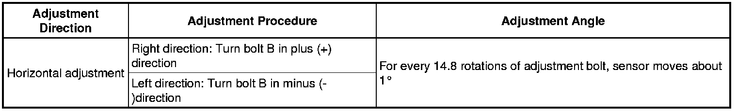 * If "LEFT SIDE: 1.0°" is displayed, the divergence is 1.0° in the left direction. Turn bolt B approximately 14.8 turns to the negative (-) side.