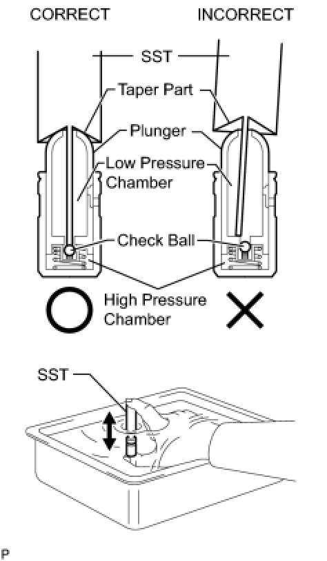 When bleeding high-pressure air from the compression chamber, make sure that the tip of SST is actually pressing the check ball as shown in the illustration. If the check ball is not pressed, air will not bleed.
