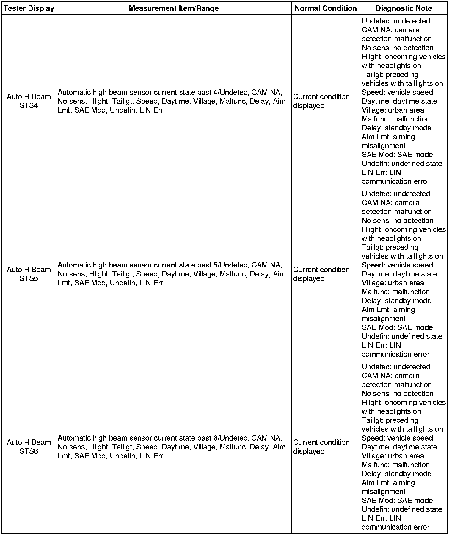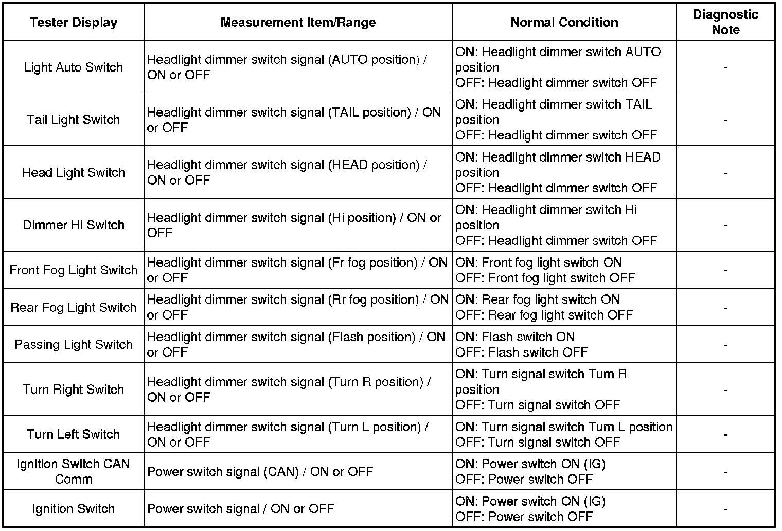 In the table below, the values listed under "Normal Condition" are reference values. Do not depend solely on these reference values when deciding whether a part is faulty or not.