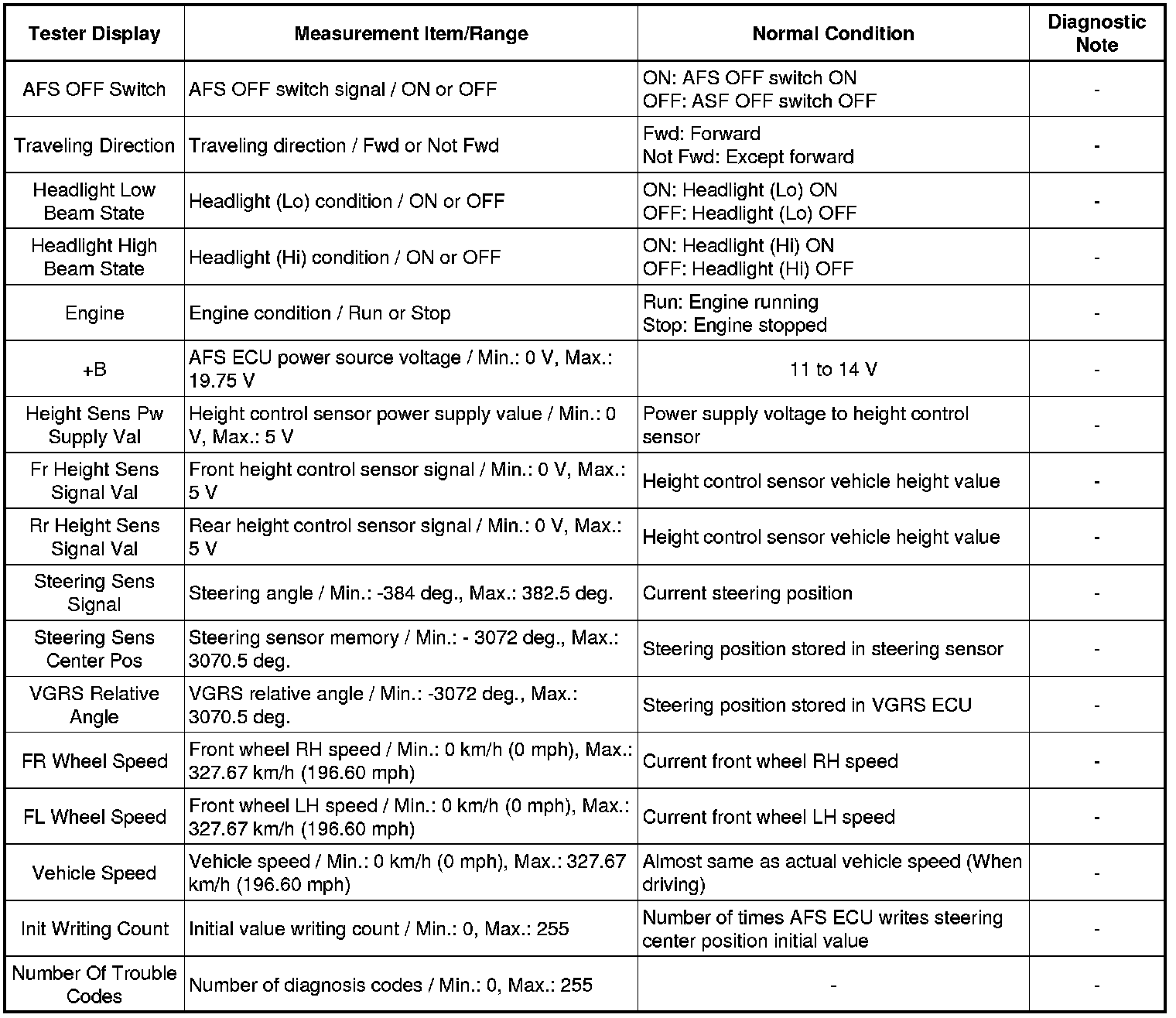 Using the Techstream to read the Data List allows the values or states of switches, sensors, actuators and other items to be read without removing any parts. This non-intrusive inspection can be very useful because intermittent conditions or signals may be discovered before parts or wiring is disturbed. Reading the Data List information early in troubleshooting is one way to save diagnostic time.