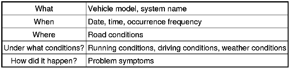 The most difficult case in troubleshooting is when no problem symptoms occur. In such a case, a thorough problem analysis must be carried out. A simulation of the same or similar conditions and environment in which the problem occurred in the customer's vehicle should be carried out. No matter how much skill or experience a technician has, troubleshooting without confirming the problem symptoms will lead to important repairs being overlooked and mistakes or delays.