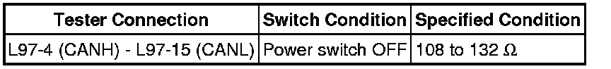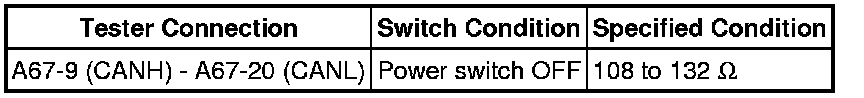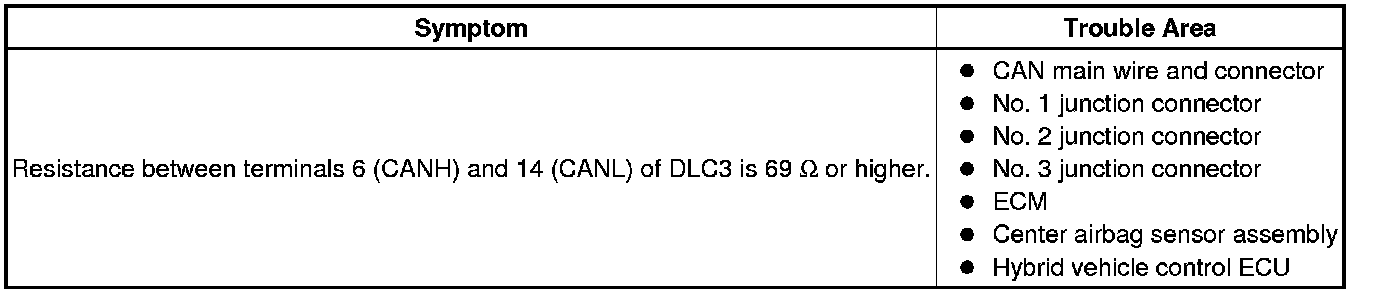 There may be an open circuit in the CAN main wire and/or the DLC3 branch wire when the resistance between terminals 6 (CANH) and 14 (CANL) of the DLC3 is 69 Ohms or higher.