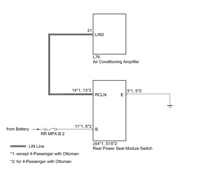 The LIN communication of the components related to the rear heater occurs between the air conditioning amplifier (A/C ECU) and rear power seat module switch.