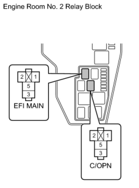 (a) Remove the EFI MAIN relay and C/OPN relay from the engine room No. 2 relay block.