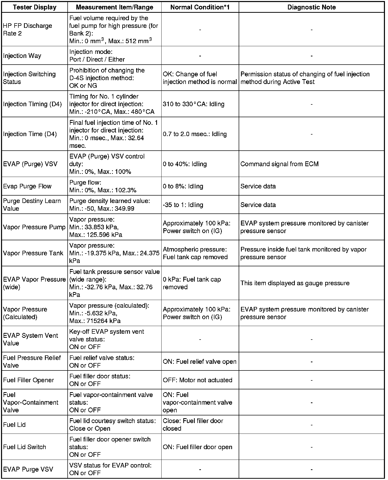 Using the Techstream to read the Data List allows the values or states of switches, sensors, actuators and other items to be read without removing any parts. This non-intrusive inspection can be very useful because intermittent conditions or signals may be discovered before parts or wiring is disturbed.