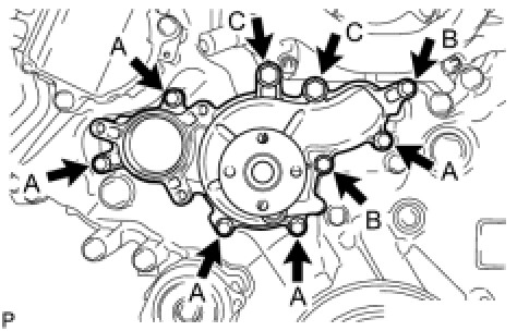 Install the water pump and a new gasket with the 9 bolts as shown the illustration.