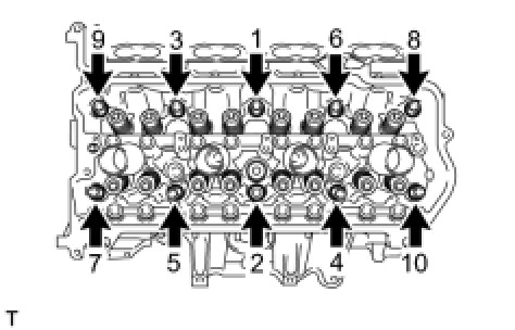 Install and uniformly tighten the 10 cylinder head bolts with the plate washers in several steps, in the sequence shown in the illustration.