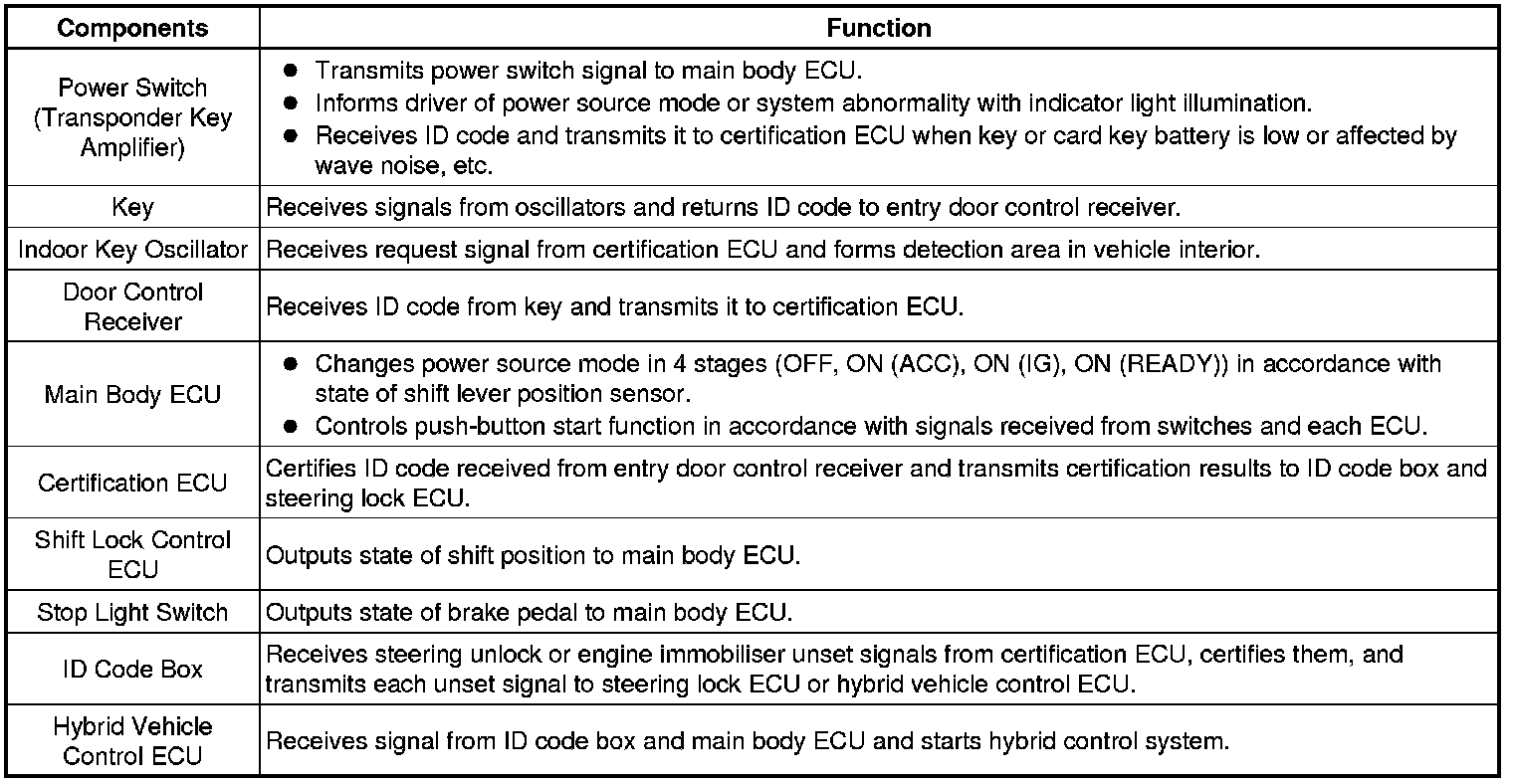 (a) The push-button start uses a push-type power switch, which the driver can operate by merely carrying the key. This system consists primarily of the main body ECU, power switch, ID code box, steering lock ECU, key, D-ACC relay, D-IG1 relay, ignition relay No. 2 (IG2) and certification ECU. The main body ECU controls the system. This function operates in cooperation with the smart access system with push-button start. The table below shows the transition of the power switch, which depends on whether the brake pedal is depressed or released.