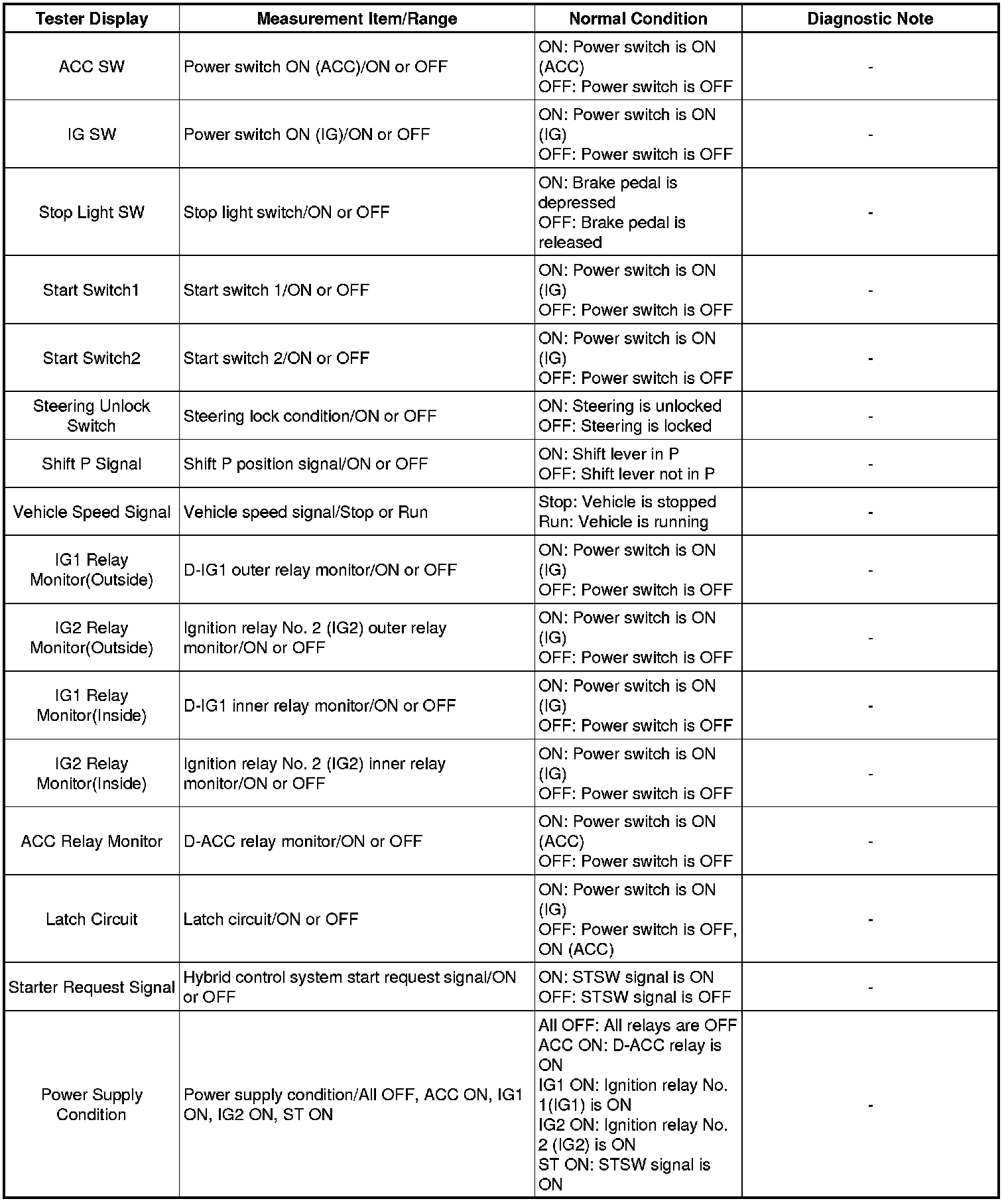 Using the Techstream to read the Data List allows the values or states of switches, sensors, actuators and other items to be read without removing any parts. This non-intrusive inspection can be very useful because intermittent conditions or signals may be discovered before parts or wiring is disturbed. Reading the Data List information early in troubleshooting is one way to save diagnostic time.