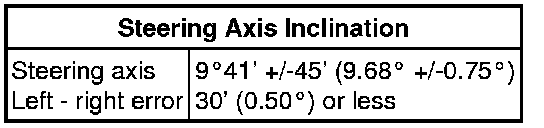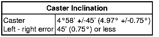 If the caster and steering axis inclinations are not within the specified values, after the camber has been correctly adjusted, recheck the suspension parts for damaged and/or worn out parts.