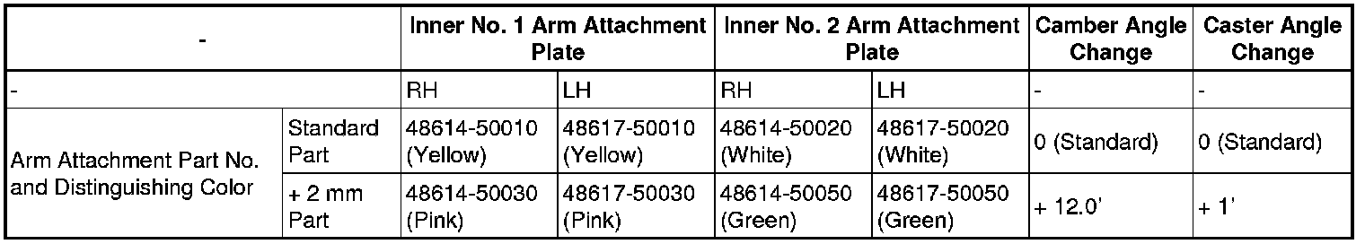 (a) If the right and left camber values are not within the specified value even though the camber and caster have been adjusted with the toe adjusting cam and camber adjusting cam, replace the inner No. 1 and No. 2 arm attachment plates and perform the camber adjustment.
