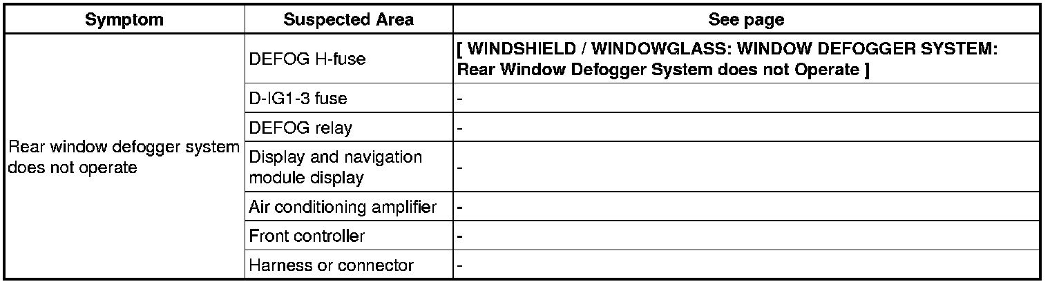 WINDSHIELD / WINDOWGLASS: WINDOW DEFOGGER SYSTEM: PROBLEM SYMPTOMS TABLE