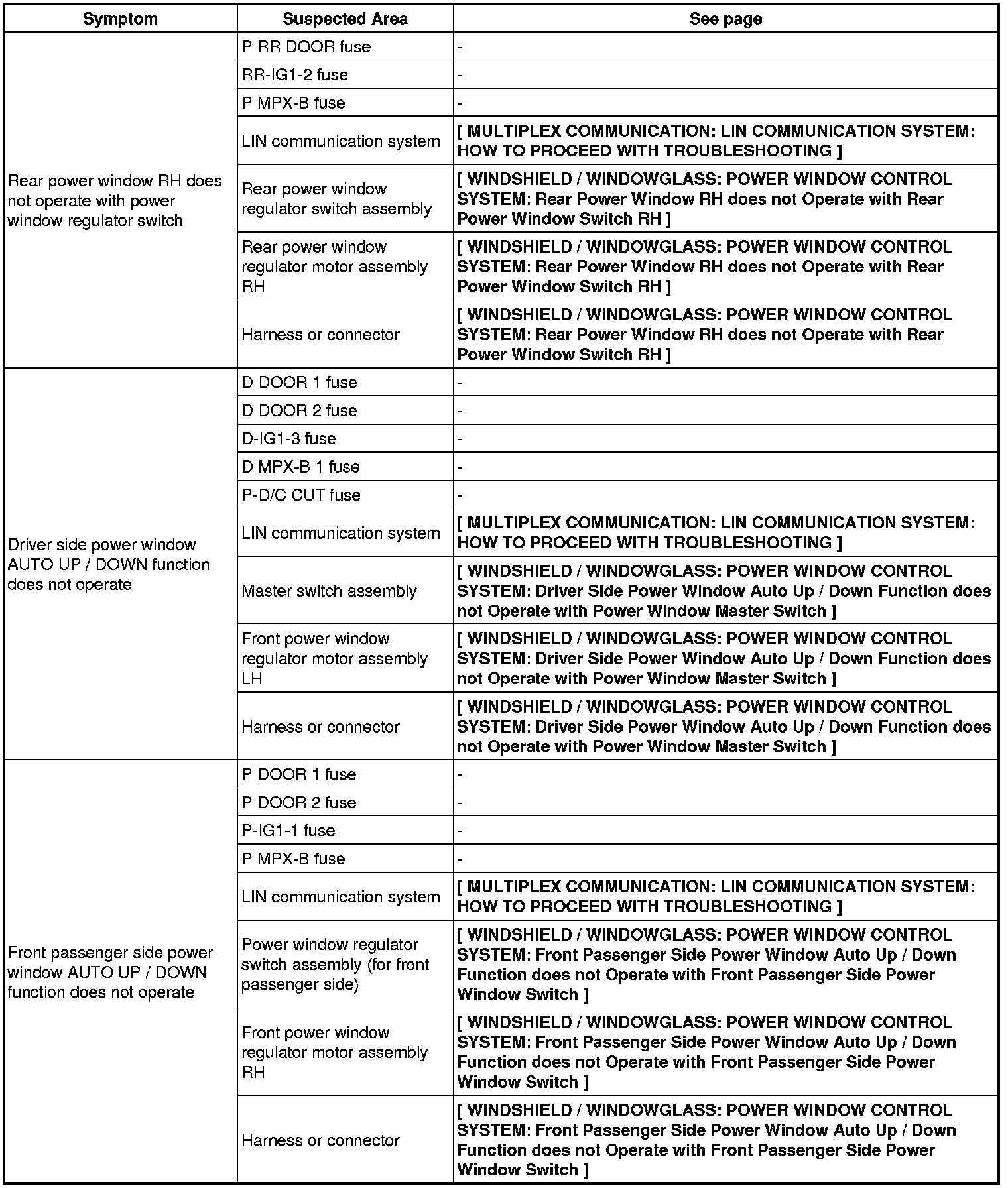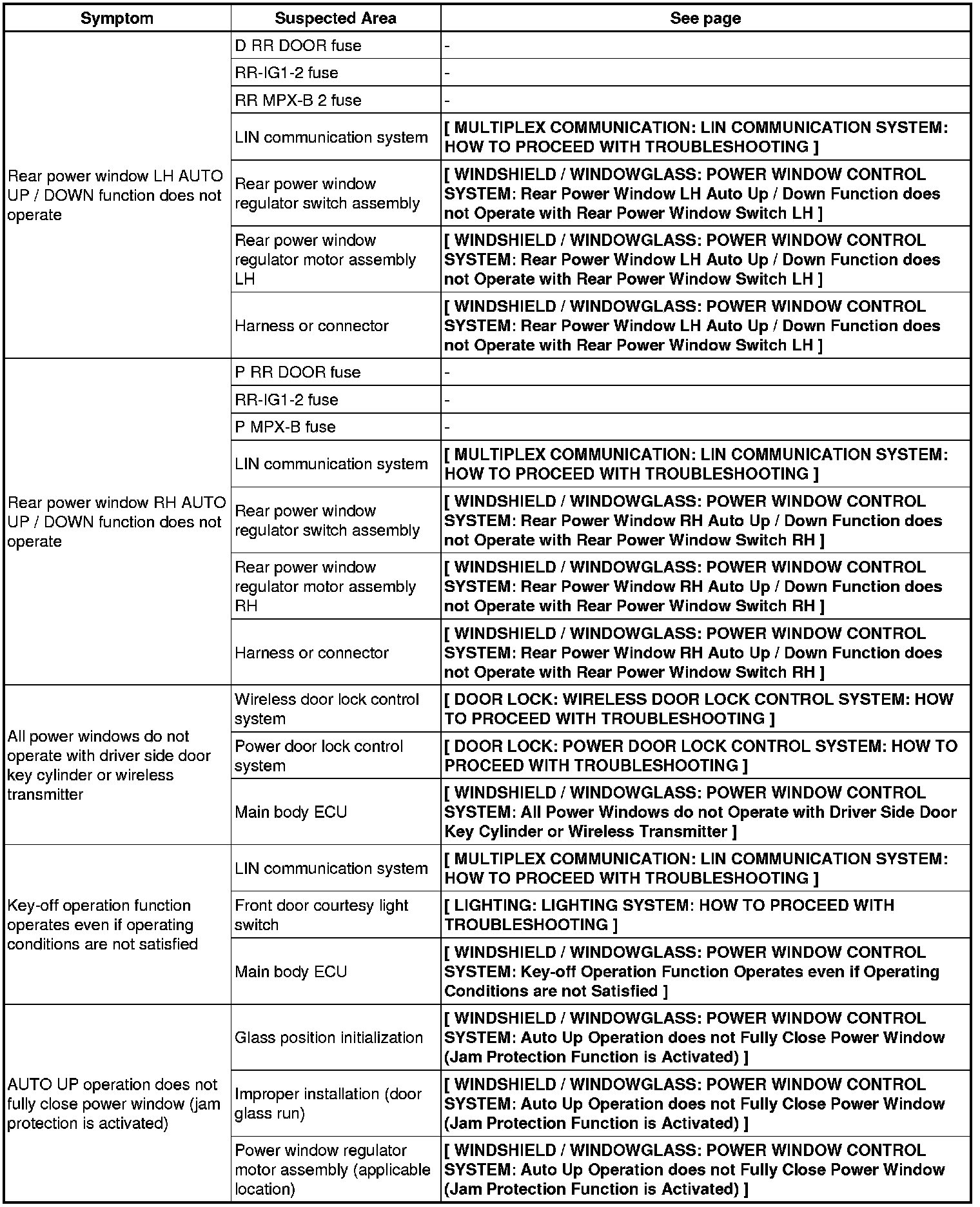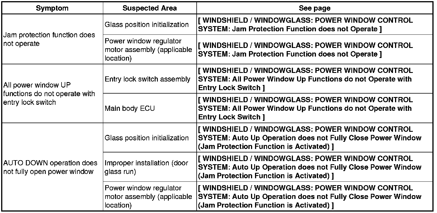 WINDSHIELD / WINDOWGLASS: POWER WINDOW CONTROL SYSTEM: PROBLEM SYMPTOMS TABLE