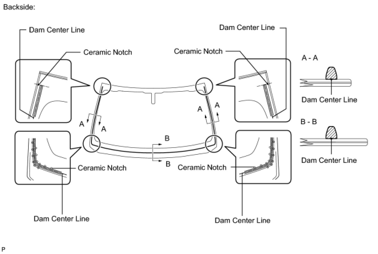 (b) Remove the peeling paper from the adhesive part of the dam. Install the dam (adhesive side) to the glass (Primer G area), but exclude the area above the notches on the upper part of the glass.