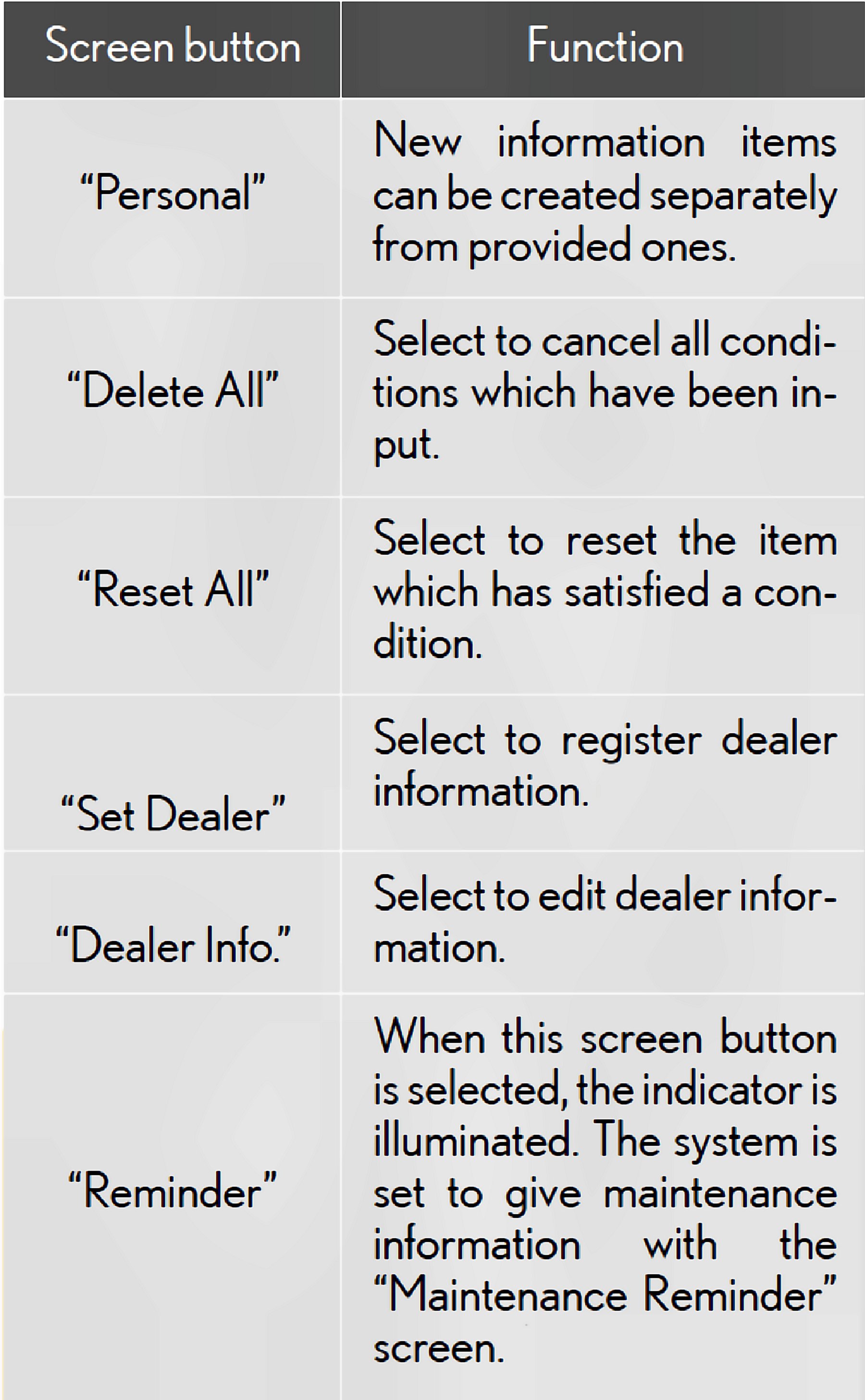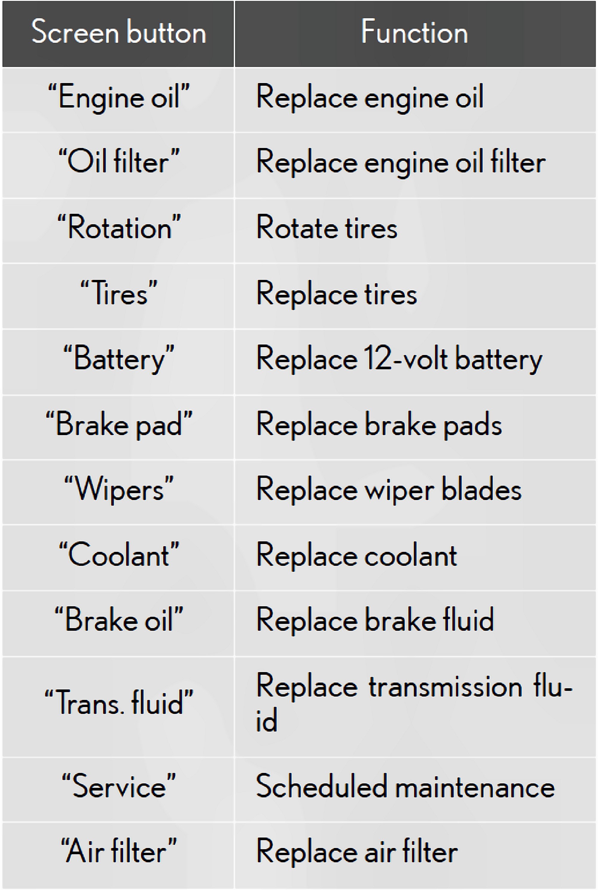 - When the vehicle needs to be serviced, the screen button color will change to orange