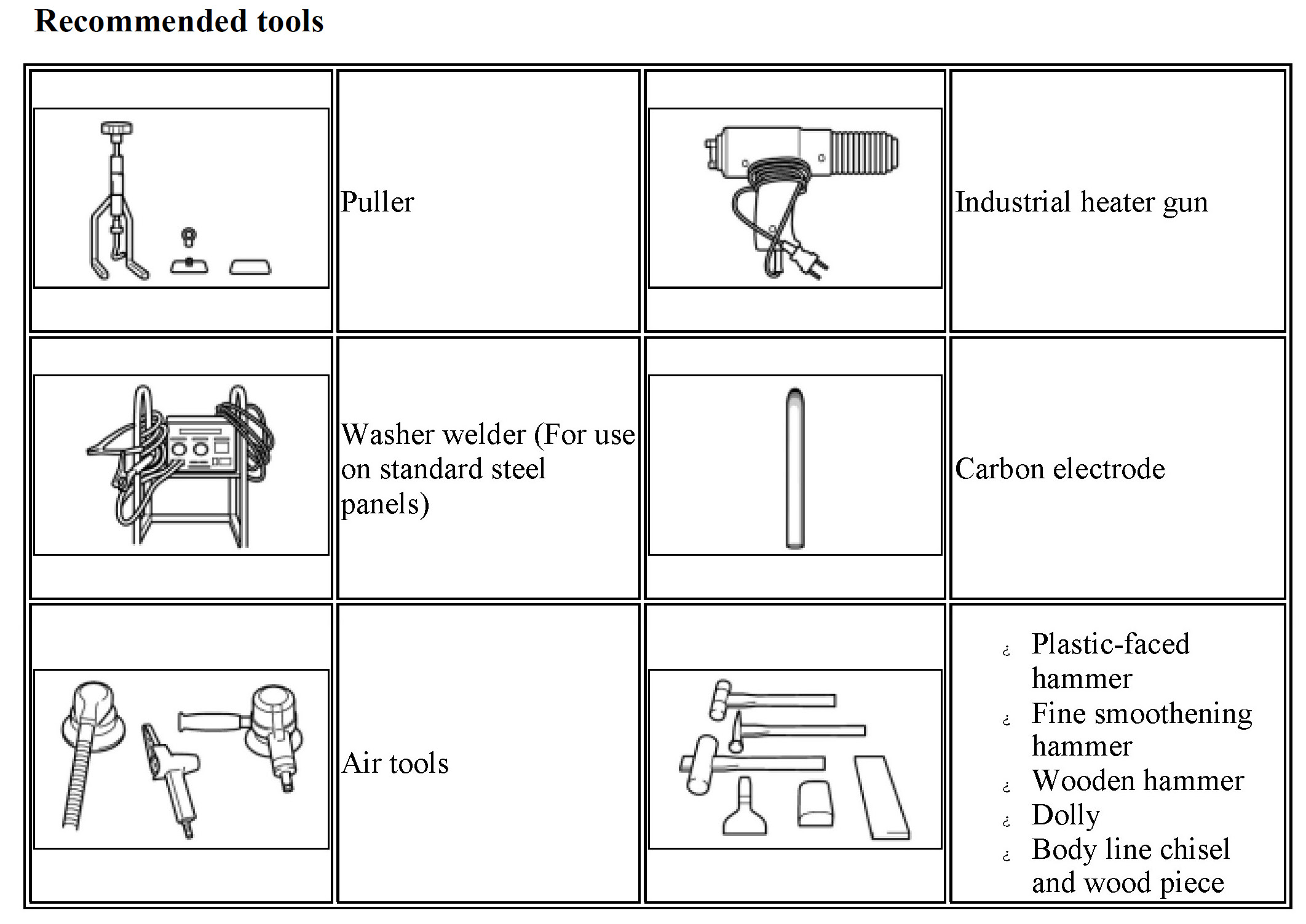 Therefore make sure to completely clean off iron particles on the surface of tools if using them to repair steel parts before use, or prepare a separate set of tools (hammers, dollies, chisels, air sander, carbon electrode, etc.) for use on aluminum alloys only.