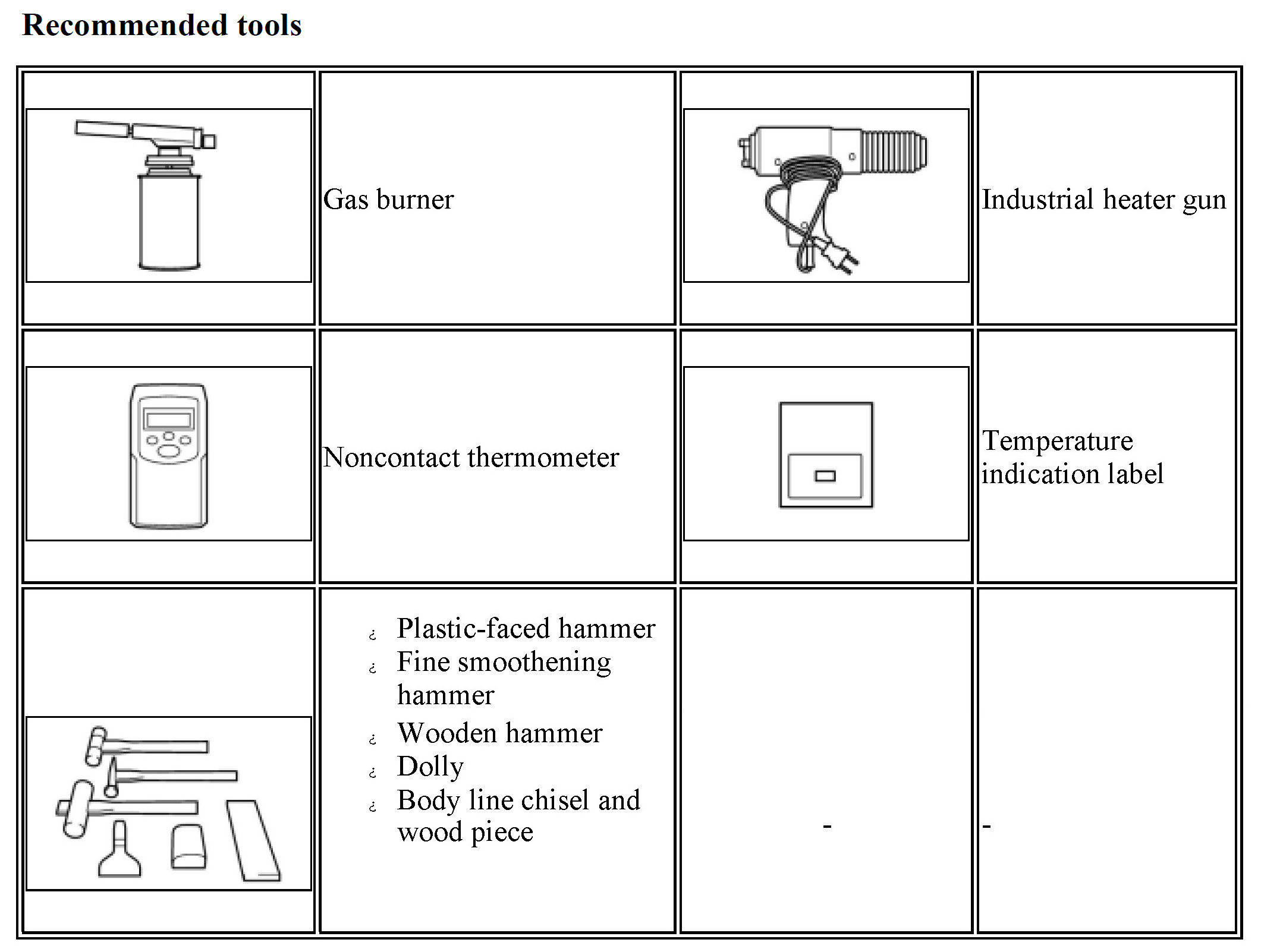 NOTICE: Make sure to completely clean off iron particles on the surface of the tools above if using them to repair steel parts before use, or prepare a separate set of tools for use on aluminum alloys only (to prevent galvanic corrosion of the aluminum).