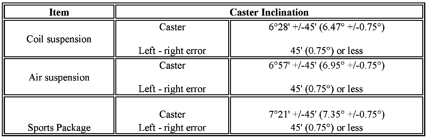 If the caster and steering axis inclination are not within the specified values, after the camber has been correctly adjusted, recheck the suspension parts for damaged and/or worn out parts.
