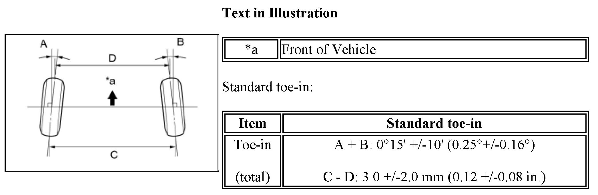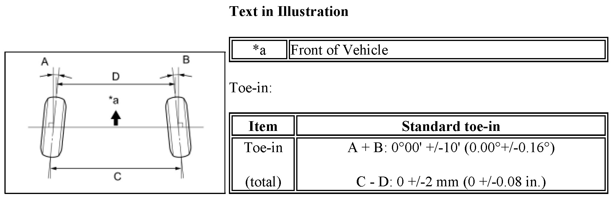 If the toe-in is not within the specified range, inspect the suspension parts and replace if necessary.
