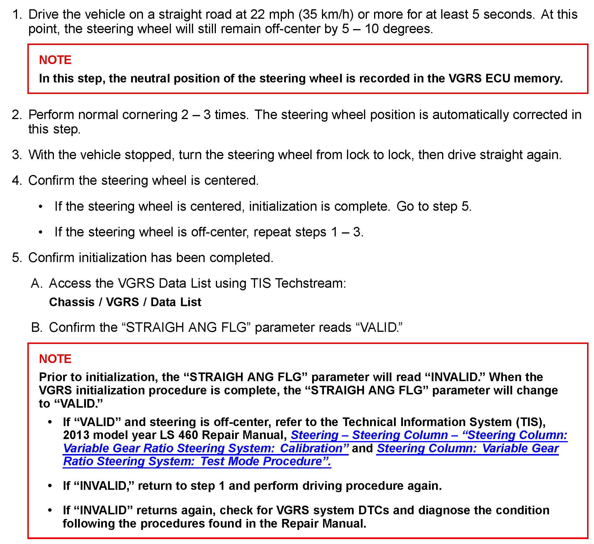 Do NOT adjust the steering wheel centering (i.e., do NOT adjust tie rod ends) before initialization of the VGRS system, or the steering may be off-center after initialization.