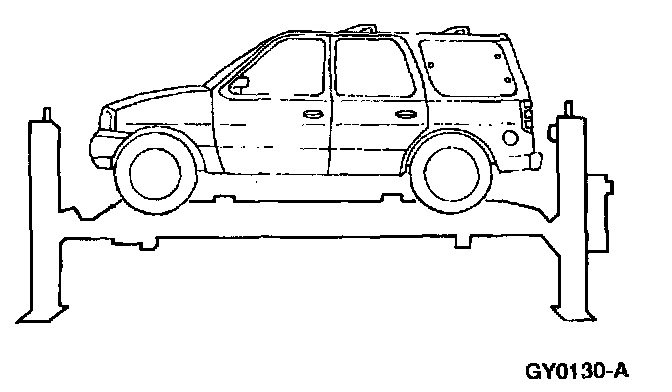 CAUTION: Damage to suspension, exhaust and steering linkage components may occur if care is not exercised when positioning the hoist adapters prior to lifting the vehicle.
