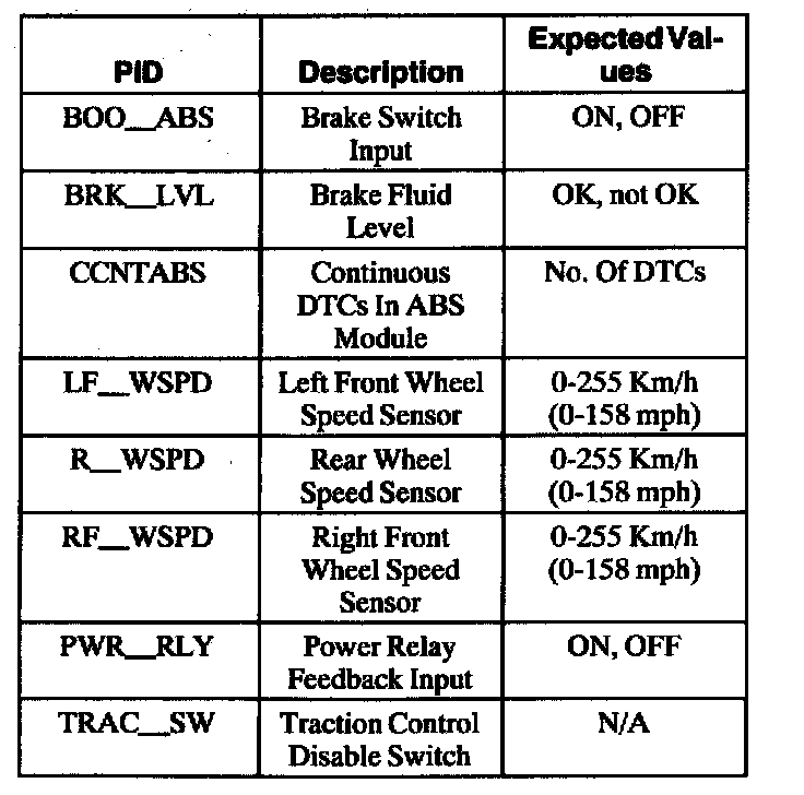ABS Control Module Parameter Identification (PID) Index