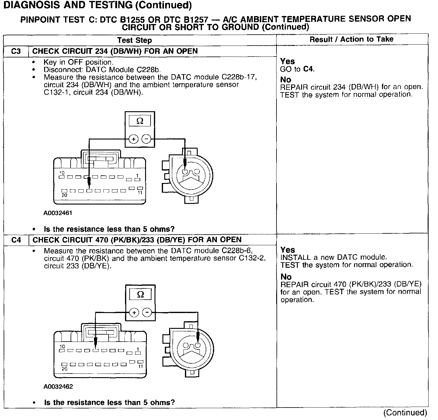 Under normal operation the ambient air temperature sensor receives a ground from the Dual Automatic Temperature Control (DATC) module through circuit 470 (PK/BK)/233 (DB/YE). A 5 volt reference voltage is supplied to the ambient air temperature sensor from the DATC module through circuit 234 (DB/WH).