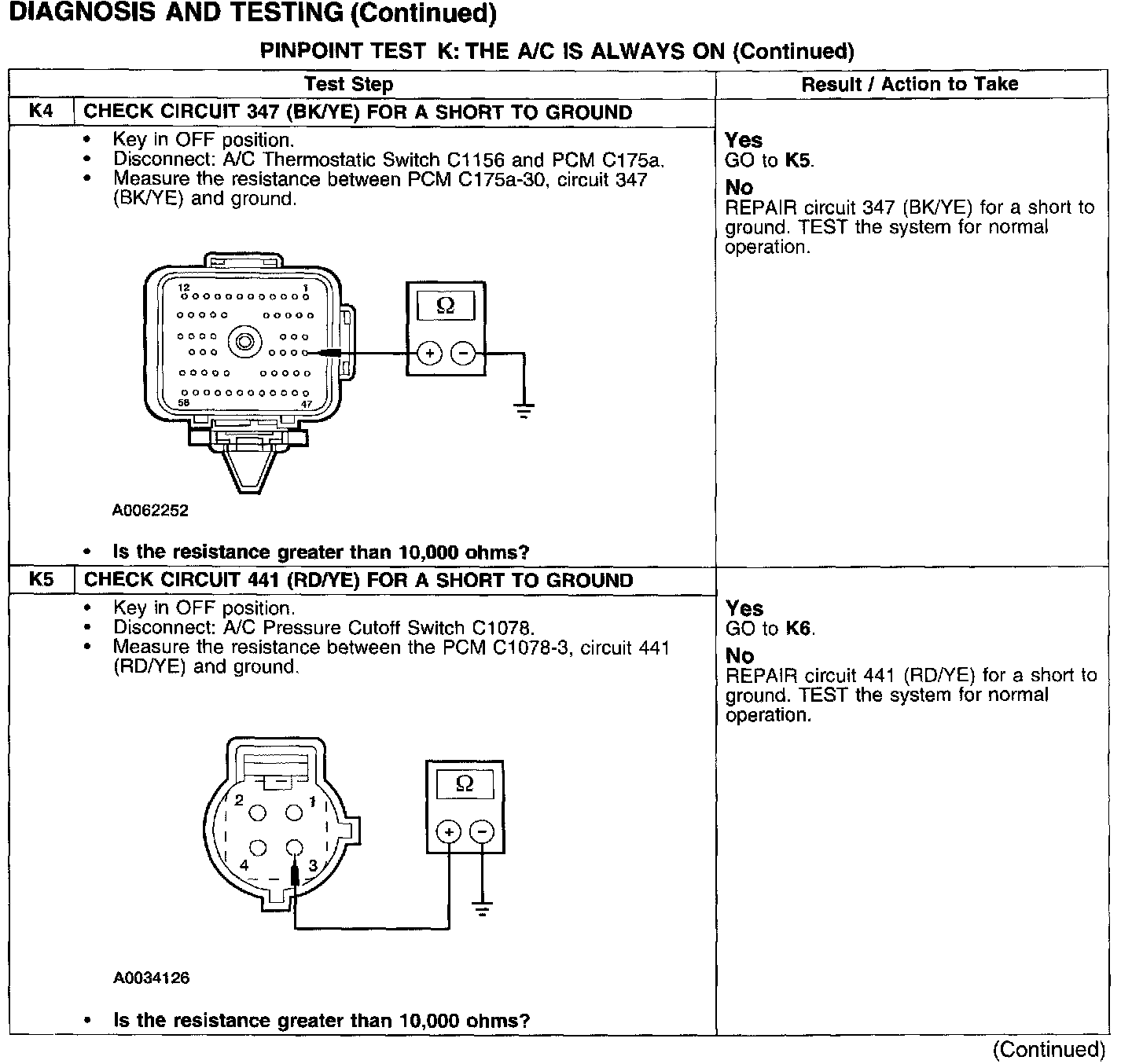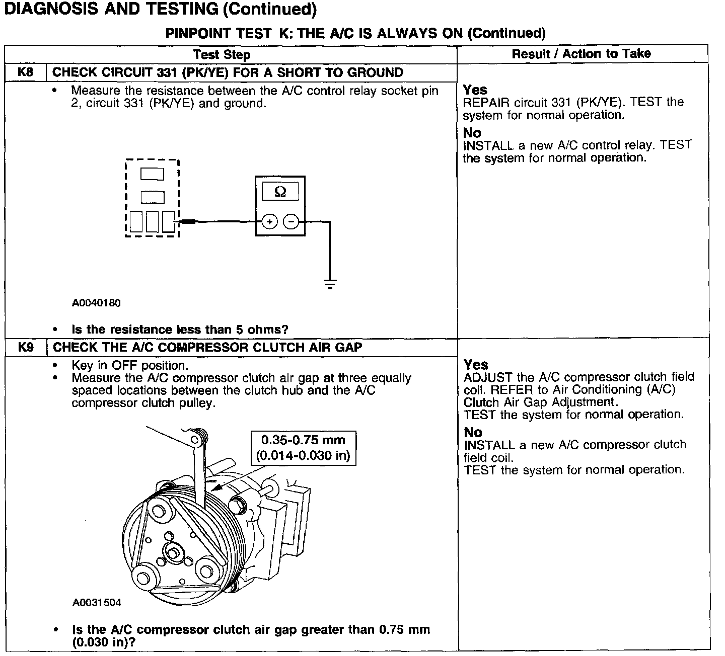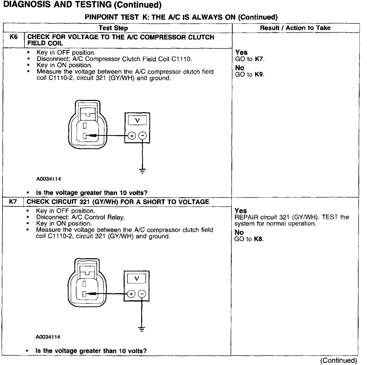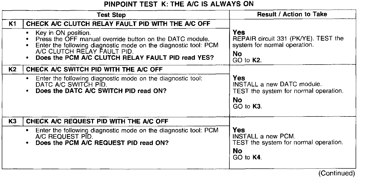 PINPOINT TEST K: THE A/C IS ALWAYS ONTest K1-K3: