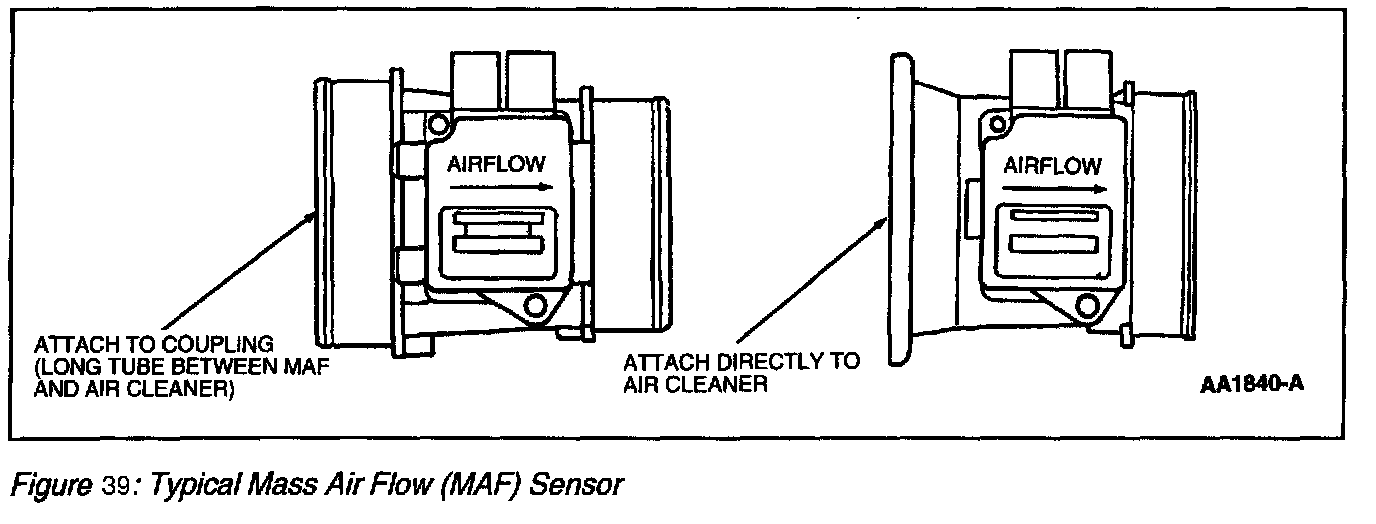 The mass air flow (MAF) sensor uses a hot wire sensing element to measure the amount of air entering the engine. Air passing over the hot wire causes it to cool. This hot wire is maintained at 200°C (392°F) above ambient temperature as measured by a constant cold wire (Figure 39). If the hot wire electronic sensing element must be replaced, then the entire assembly must be replaced. Replacing only the element may change the air flow calibration.