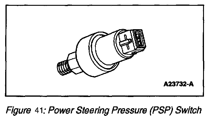 The Power Steering Pressure (PSP) switch (Figure 41) monitors the hydraulic pressure within the power steering system. The PSP switch is a normally closed switch that opens as the hydraulic pressure increases. The PCM uses the input signal from the PSP switch to compensate for additional loads on the engine by adjusting the idle rpm and preventing engine stall during parking maneuvers. Also, the PSP switch signals the PCM to adjust transmission electronic pressure control (E PC) pressure during the increased engine load, for example during parking maneuvers.