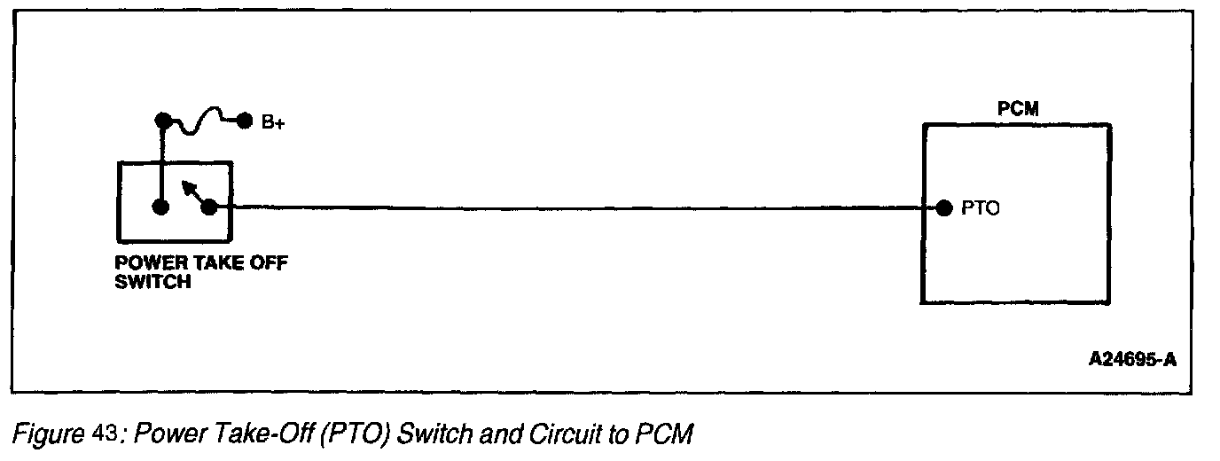 The Power Take-Off (PTO) circuit (Figure 43) is used by the PCM to disable some of the OBD II Monitors during PTO operation. The PTO circuit normally carries low voltage. When the PTO switch is on/closed, B+ is supplied to the PTO input circuit indicating to the PCM that an additional load is being applied to the engine. If this action was not reported by the PTO circuit, a false Diagnostic Trouble Code may be stored.