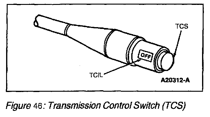 The Transmission Control Switch (TCS) (Figure 46) and (Figure 47) signals the PCM with keypower whenever the TCS is pressed. On vehicles with this feature, the Transmission Control Indicator Lamp (TCIL) lights when the TCS is cycled to disengage overdrive. The operator of the vehicle controls the position of the TCS.