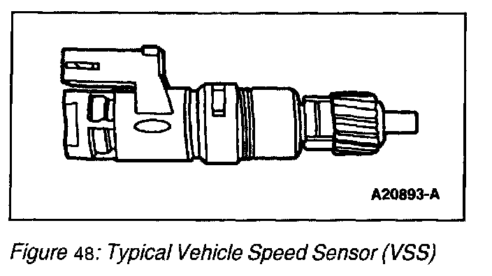 The Vehicle Speed Sensor (VSS) (Figure 48) is a variable reluctance or Hall-effect sensor that generates a waveform with a frequency that is proportional to the speed of the vehicle. If the vehicle is moving at a relatively low velocity, the sensor produces a signal with a low frequency. As the vehicle velocity increases, the sensor generates a signal with a higher frequency. The PCM uses the frequency signal generated by the VSS (and other inputs) to control such parameters as fuel injection, ignition control, transmission/transaxle shift scheduling and torque converter clutch scheduling.