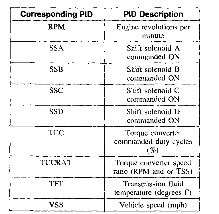 The Pressure Control (PC) solenoids for this transmission are not directly controlled during DRIVE MODE testing. Pressures may be raised during an upshift via the harsh shift control channel (FIRM-SF-F)