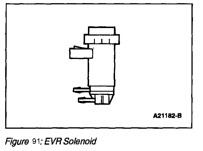 The EGR Vacuum Regulator Solenoid (EVR), (Figure 89) is an electromagnetic device which is used to regulate the vacuum supply to the EGR valve. The solenoid contains a coil which magnetically controls the position of a disc to regulate the vacuum. As the duty cycle to the coil increases, the vacuum signal passed through the solenoid to the EGR valve also increases. Vacuum not directed to the EGR valve is vented through the solenoid vent to atmosphere. Note that at 0% duty cycle (no electrical signal applied), the EGR vacuum regulator solenoid allows some vacuum to pass, but not enough to open the EGR valve.