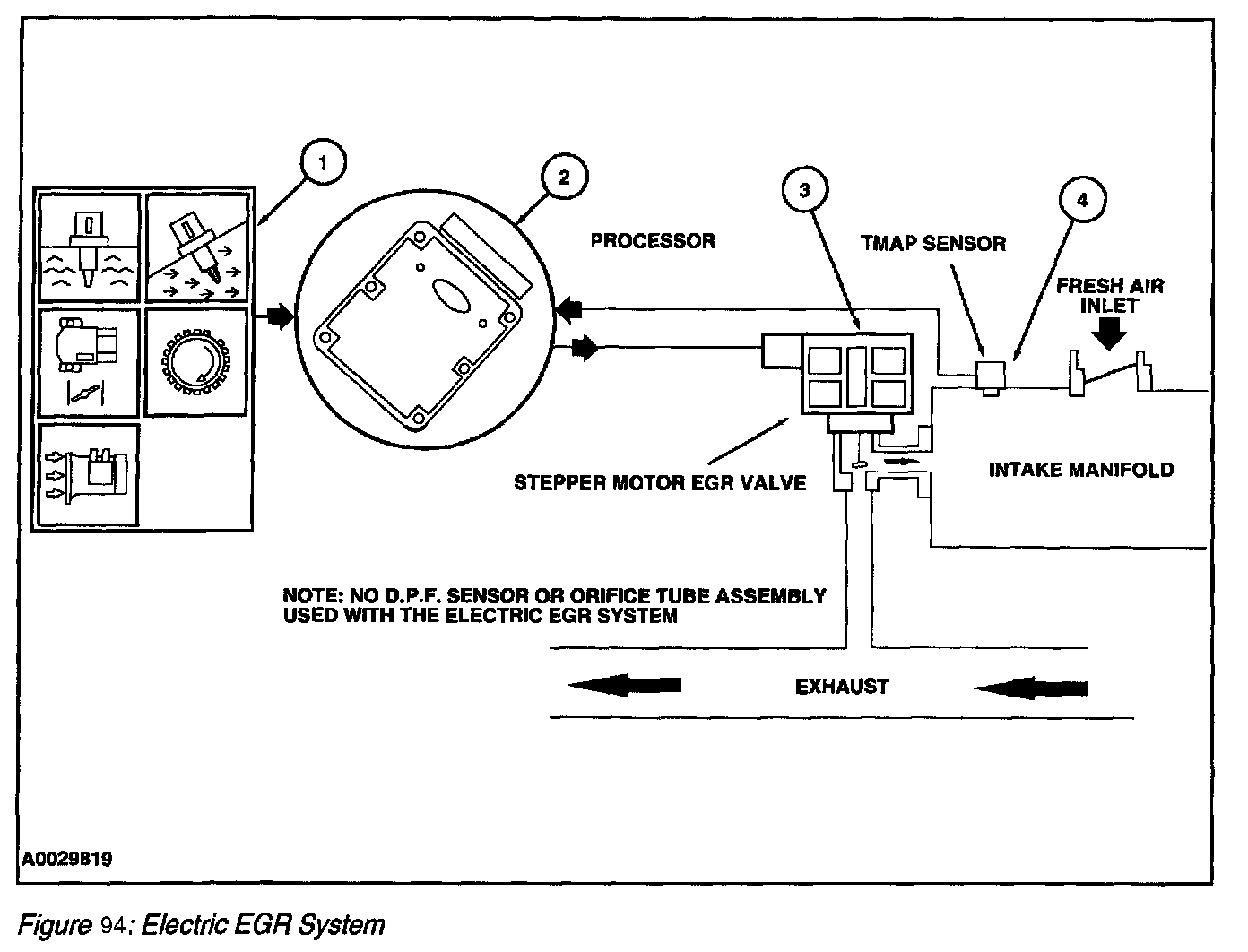 The EEGR system consists of an electric motor/EGR valve integrated assembly, a PCM, and connecting wiring. Additionally a MAP sensor is also required. Operation of the system is as follows (Figure 92):