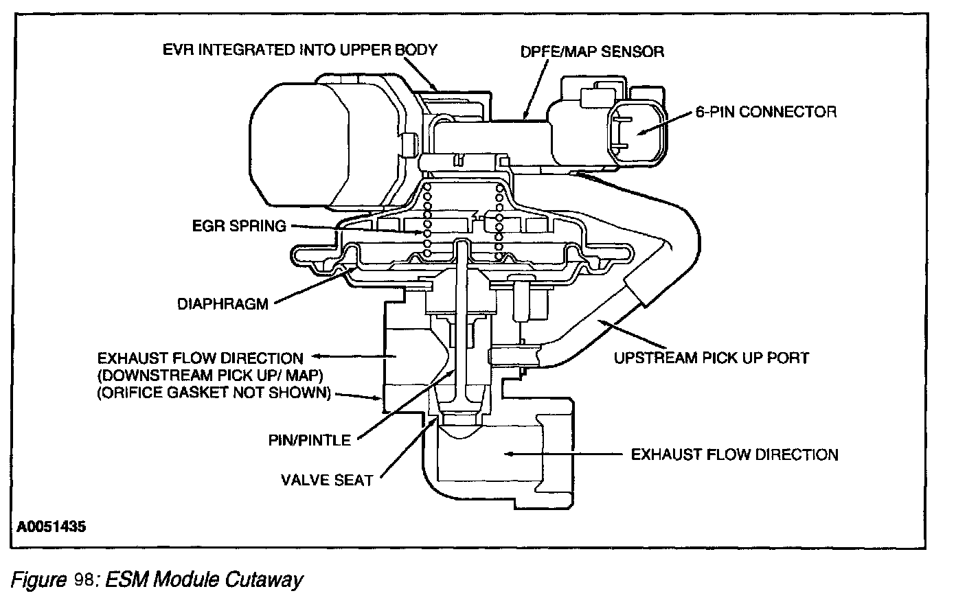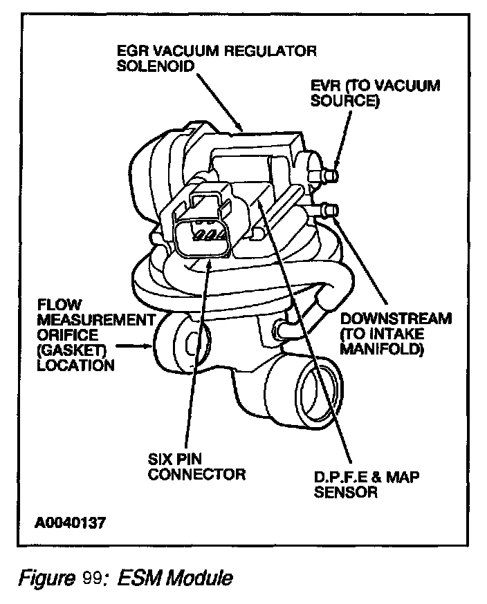 The ESM EGR system is an updated DPFE system. It functions in the same manner as the conventional DPFE system, however the various system components have been integrated into a single component called the EGR System Module (ESM) (Figure 95) The flange of the valve portion of the ESM bolts directly to the intake manifold with a metal gasket that forms the measuring orifice. This arrangement increases system reliability and response time. By relocating the EGR orifice from the exhaust to the intake side of the EGR valve, the downstream pressure signal measures Manifold Absolute Pressure (MAP). The system provides the PCM with a differential DPFE signal, identical to the traditional DPFE system.