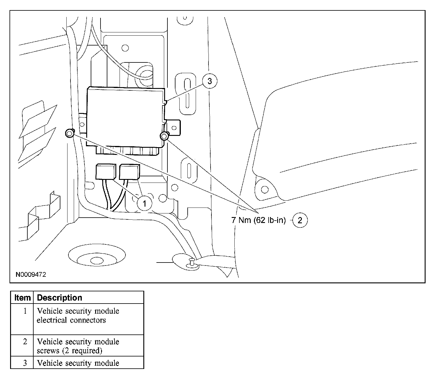 CAUTION: Prior to the removal of the vehicle security module, it is necessary to upload the module configuration information to the diagnostic tool. This information needs to be downloaded into the new module once installed.