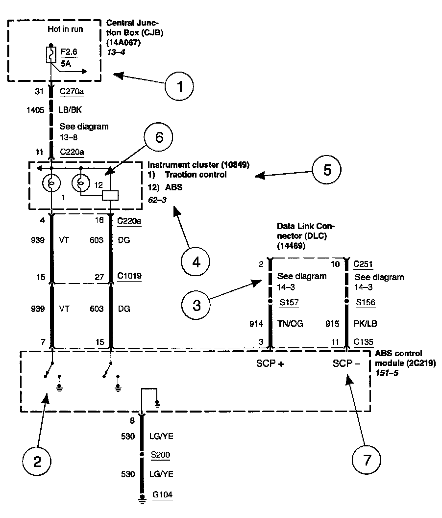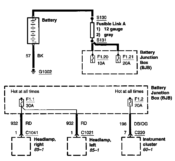 Each set normally starts with the component that powers the circuit, such as a fuse or the ignition switch. Current flow is shown from the power source at the top of the diagram to ground at the bottom of the diagram. A full representation of the power supply of a fuse or the power distribution from a fuse to various components is given in the Power and Ground Distribution Diagrams. Full representation of the ground connections are shown in the Power and Ground Distribution Diagrams.
