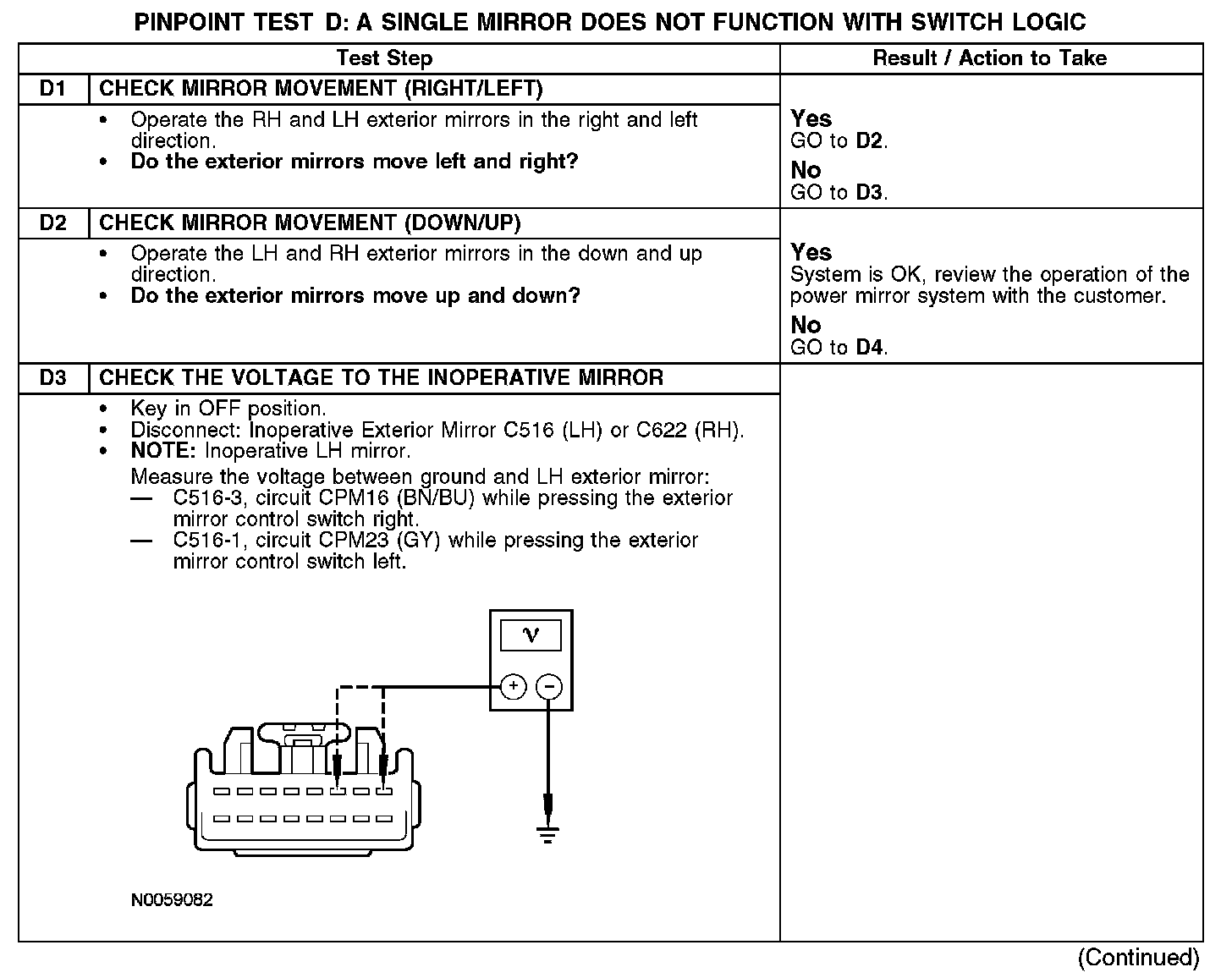 - When ground is received through circuit CPM16 (BN/BU) or CPM20 (BN/WH) and power through circuit CPM23 (GY), the LH or RH exterior mirror glass will move right.