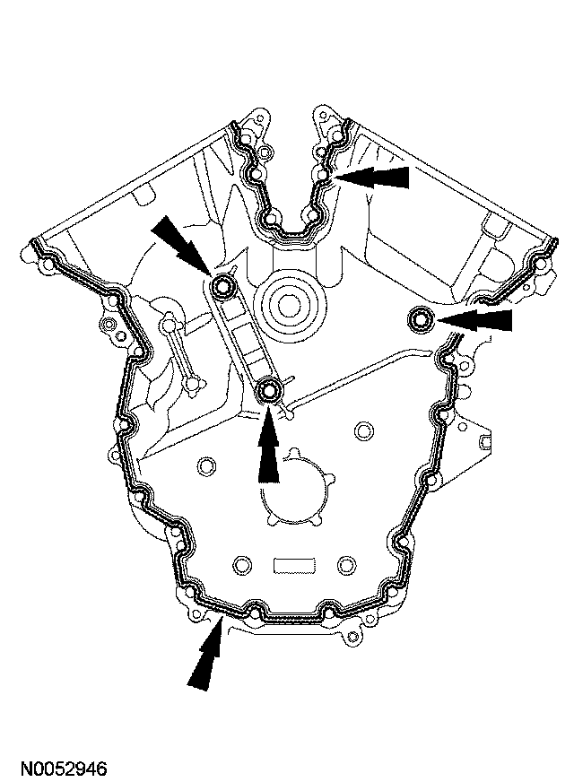 Apply a 8 mm (0.31 inch) bead of silicone gasket and sealant to the engine front cover-to-RH cylinder head joints.